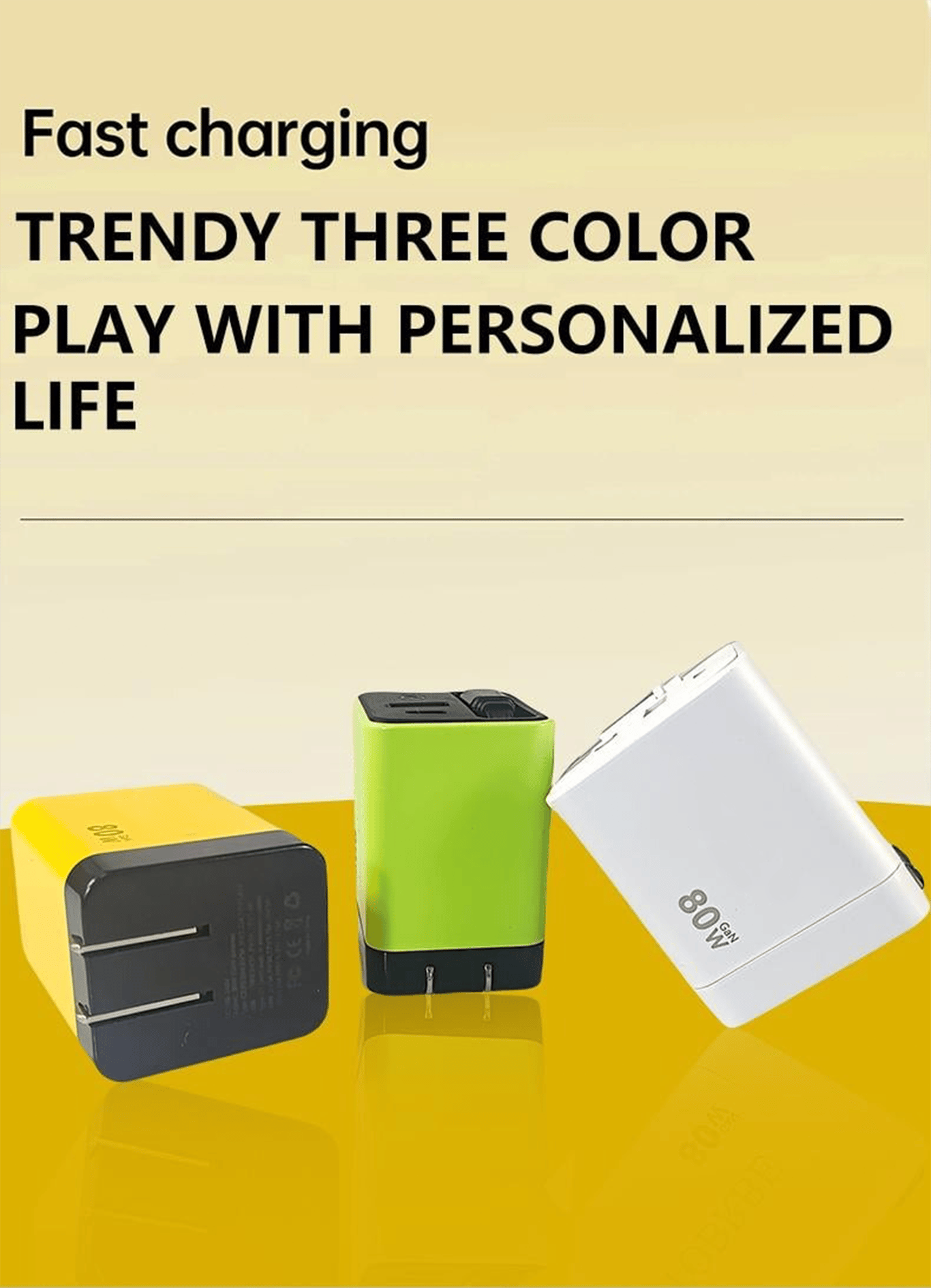 Product Introduction of TOBRBE 3 in 1 GaN Charger, Retractable 80W MAX Fast Charger Block with Type-C Cable & 2 USB Ports, Portable Adapter iPhone Smartphone Electronic, Yellow, Cellphone, Folding Charging 3